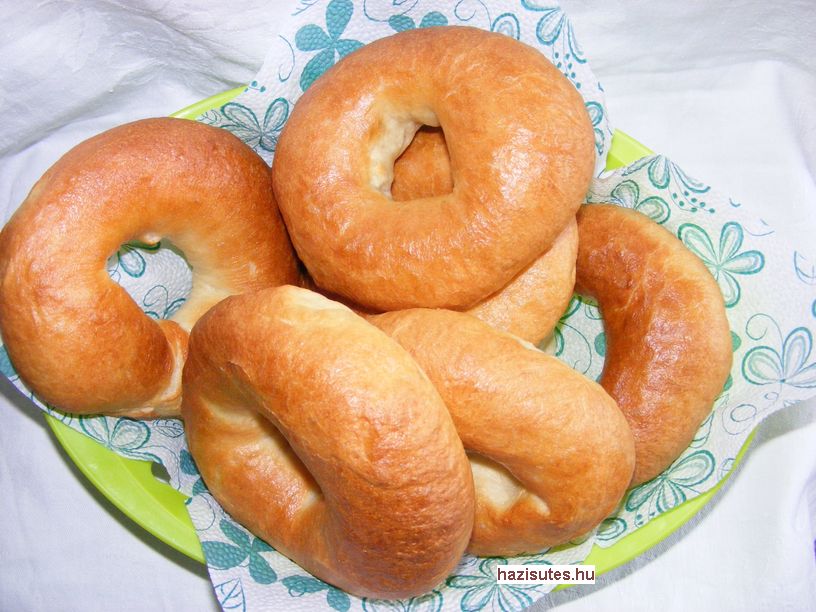 Bagel Férjem óhaja volt, hogy kóstoljuk meg a bagelt. Többször gondoltam már a sütésére, de a vízfürdő miatt nehezen szántam rá magam. A kipróbálás során azonban beigazolódott, hogy alaptalan volt a félelmem, egyáltalán nem ördöngős ez az elkészítési mód. Hozzávalók: 60 dkg liszt 2-3 dkg cukor (lehetőleg barna) 1 tk. olaj 1 dkg vaj 1 tojás 12 g élesztő kb. 3 dl víz só Elkészítés: A lisztet beleszitálom a kelesztőtálba, hozzáadok egy kevés sót. A tojást elkeverem a cukorral, beleteszem az élesztőt, a víz egy részét, az olajat és a vajat, amit a liszt közepébe öntök. Dagasztás közben folyamatosan adom hozzá a maradék langyos vizet. Miután megkelt a tészta, deszkára borítom, és egyenlő részekre osztom őket, majd gömbölyűre formázom, mint a zsemlét. Kb. 10 percnyi pihenő után, az ujjammal kilyukasztom, és megfelelő nagyságúra tágítom a tészták közepét. Nedves konyharuhával letakarom, és még fél óráig kelesztem. Egy nagy fazékban, kevés barna cukorral, vizet forralok. Ebben oldalankén kb. 20-30 másodpercig főzöm a megkelt tésztát. Szűrőkanállal egy sütőpapírral fedett lemezre szedem a karikákat, amelyeket tetszés szerinti magokkal szórhatunk meg, de hagyhatjuk "üresen" is, mint az alábbi kép is mutatja. |