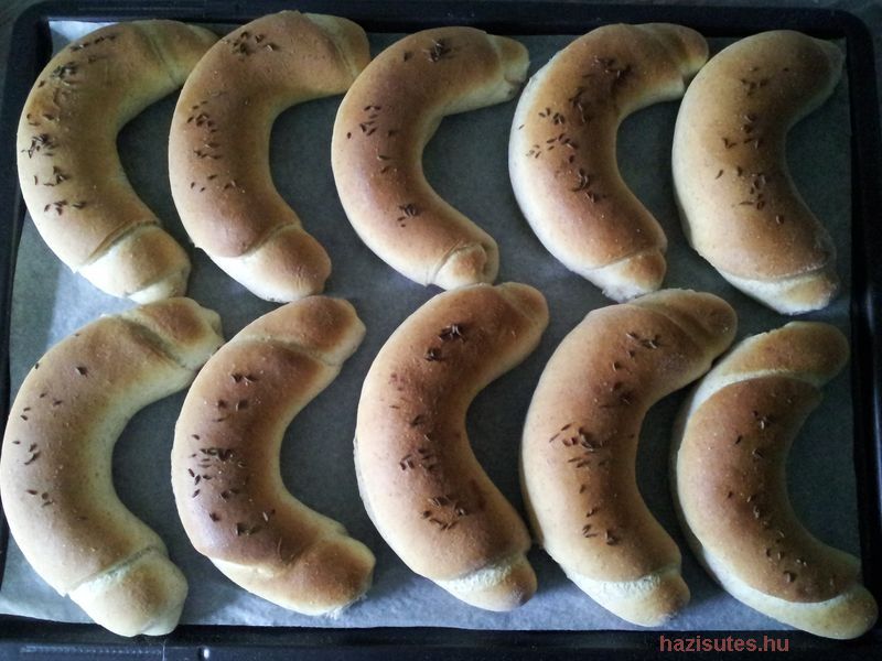 Kiflik Hozzávalók: 40 dkg finom liszt 10 dkg teljes kiőrlésű búzaliszt 3 dkg élesztő 1 dl tej 1,5 dl víz 1 dl natúr joghurt só cukor köménymag Elkészítés: A zsemlékhez hasonlóan készítem, mind az összeállítást, mind a kelesztést. A formázás is hasonló, mert először gombócokat formázom, és azokat sodrom ki kör alakúra, és úgy tekerem fel. Sütőlemezre fektetem, és megszórom a tetejüket köménymaggal, majd 180 fokra előmelegített sütőben 20 perc alatt megsütöm |