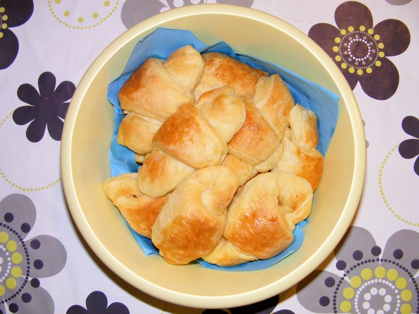 Bacon-ös croissant Ez kisfiam kedvence, éppen ezért gyakran sütök ilyet, ha ez van itthon, nem gond a másnapi tízórai vagy uzsonna csomagolása sem. Hozzávalók a tésztához: 50 dkg liszt 3 dkg élesztő 1 dl tej 1,5 dl víz 2 tojás sárgája 20 dkg vaj 2-3 evőkanál tejföl 1 kiskanál cukor só olaj a töltelékhez: paradicsompüré só bors olaj bacon Elkészítés: Az élesztőt felfuttatjuk a cukros tejben, közben egy tálba szitáljuk a lisztet. Hozzáadjuk az élesztőt, a tojások sárgáit, a tejfölt, 1 evőkanál vajat és a vizet. Összedolgozzuk, a tésztát egy olajjal kikent tálban 1 órára hűtőbe tesszük. Közben a vajat szobahőmérsékleten tartjuk, mert fontos, hogy kenhető legyen. Az 1 órán át pihent tésztánkat lisztezett deszkán vékonyra kinyújtjuk, és rákenjük a vajat. Összehajtogatjuk, majd újabb 1 órára hűtőbe rakjuk. Amikor ez is letelt, ismét kinyújtjuk a tésztát, kb. fél centisre, és megkenjük a paradicsompüré, só, bors, olaj keverékével, és rárakjuk a bacon-t. Feltekerjük kifli alakúra, a tetejét megkenjük tojásfehérjével, és sütőlemezen, 180 fokos előmelegített sütőben 15-20 perc alatt megsütjük. |