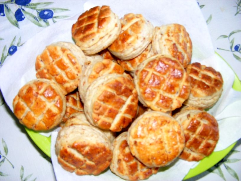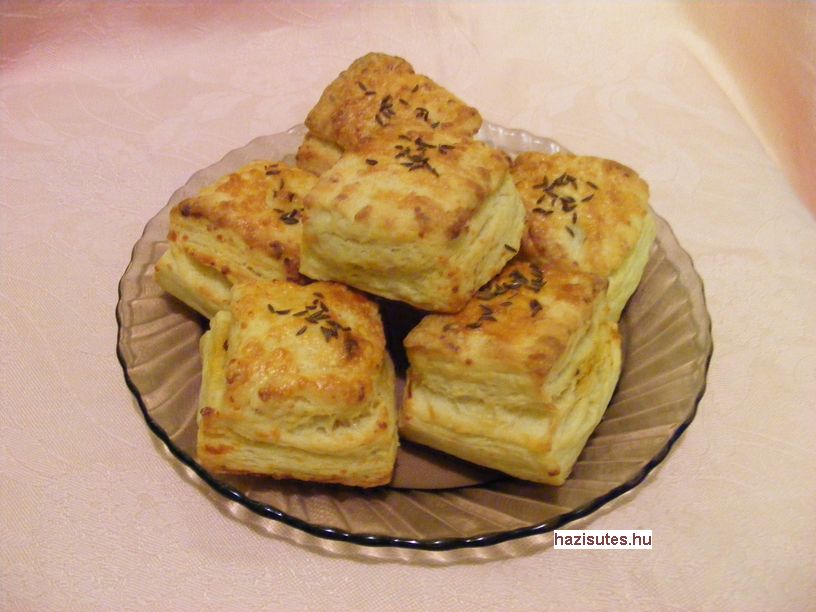 Kolbászos pogácsa Ezt a receptet is az erdélyi szakácskönyvemben találtam. Kipróbáltam a kolbász nélküli változatát, úgy is remek. Hozzávalók: 30 dkg liszt 20 dkg vaj 2,5 dkg élesztő 1 tojás 1,5 dl tej cukor só ecet A vajat 1 kanál liszttel és pár csepp ecettel összegyúrjuk, téglalap alaklúra formázzuk, és félretesszük. A tésztához az élesztőt egy kevés cukorral és hideg tejjel összekeverjük, majd hozzáadjuk a liszthez, amelybe már beletettük a sót, végül hozzáadjuk a tojást is. Kb. 1/2 óráig pihentetjük, akkor kisodorjuk, ráfektetjük a vajas téglalapunkat, felhajtjuk a tészta széleit, és ismét kisodorjuk. Ezt a sodrást, hajtogatást legalább háromszor, 20-30 percenként megismételjük. Az utolsó alkalommal kisodorjuk a tésztát, felére kolbászdarabokat rakunk, amit beborítunk a tészta másik felével, majd kis kockákat formázunk, tetejüket megkenjük tojással és megszórjuk reszelt sajttal, köménnyel, szezámmaggal, kinek mi szimpatikus, vagy éppen mi van otthon. Tepsibe rakjuk, rövid ideig még kelesztjük őket, majd előmelegített sütőben megsütjük. |