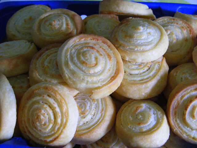 Sajtos csiga Egy kis változatosság azoknak, akik kedvelik a pogácsákat, néha azonban mégis valami másra vágynak. Hozzávalók a tésztához: 50 dkg liszt 25 dkg vaj vagy margarin 1 cs. sütőpor 1 pohár tejföl 2 tojás sárgája Töltelék: 20 dkg reszelt sajt 20 dkg vaj só (a mennyisége attól függ, hogy mennyire sós sajtot használunk) Elkészítés: Érdemes először a töltelékkel kezdeni. A hozzávalókat jól összekeverjük, és felretesszük, amíg elkészítjük a tésztát. A liszthez hozzáadjuk a sütőport, elmorzsoljuk benne a vajat. A tojássárgákat elkeverjük a tejfölben, és hozzáadjuk a lisztes keverékhez. Összegyúrjuk és három cipóra osztjuk. Mindegyiket vékonyra kinyújtjuk, és rákenjük a tölteléket. Feltekerjük, mint a kalácsot, és folpackba csavarva egy éjszakára hűtőbe tesszük. Másnap ujjnyi vastag szeleteket vágunk, sütőlemezre rakjuk és forró sütőben megsütjük. |
