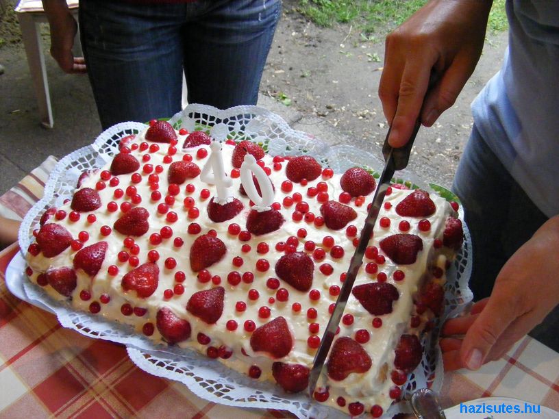 Epertorta Ezt a receptet a nagynénémtől kaptam, meg még egy sor másikat, ugyanis édesanyám féltve őrzött füzete után, megkaptam nagynéném süteményesét is, igaz csak ideiglenesen, de nekem ez is bőven elég, a másolat ugyanolyan jó... Hozzávalók a tésztához: 7 tojás 20 dkg cukor 27 dkg liszt 1 teáskanál sütőpor 7 evőkanál víz A krémhez: 1 cs. vaníliás puding 1/2 l tejszín eper Elkészítés: A tésztát a vizes piskótának megfelelően megsütjük egy nagyobb tepsiben vagy formában, mert ennek a közepébe nem kerül krém, csak a tetejére, bár én már készítettem a klasszikus, töltött változatban, sőt az epret helyettesítettem barackkal is. A krémhez a pudingot megfőzzük és kihűtjük. Közben felverjük a tejszínt, a felét összekeverjük a pudinggal, és apróra vágott epret adunk hozzá. A krémet rákenjük a tortára, majd bevonjuk a félretett tejszínnel. |