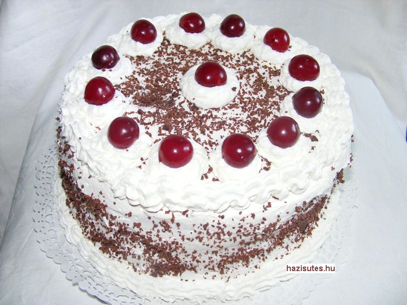 Feketeerdő torta Már régóta gondolkodtam, hogy ezt a tortafajtát is meg kellene próbálnom. Az igazán nagy inspirációt a meggyszezon adta, úgyhogy nem is konzervet használtam hozzá, hanem friss gyümölcsöt. Hozzávalók a tésztához: 6 tojás 27 dkg liszt 3 dkg kakaópor 24 dkg cukor 6 ek. víz A krémhez: 2 cs. vaníliás puding 1/2 l meggylé 25 dkg cukor 1/2 l tejszín meggy Elkészítés: A hozzávalókból kakaós piskótát sütünk. Közben elkészítjük a krémet, amelyhez a pudingból, a meggyléből és a cukorból sűrű krémet főzünk, amikor kihűlt, beleforgatjuk a tejszín kb.2/3-át, az 1/3-át a díszítéshez használjuk. A krémbe is kevertem apróra vágott meggydarabokat. |
