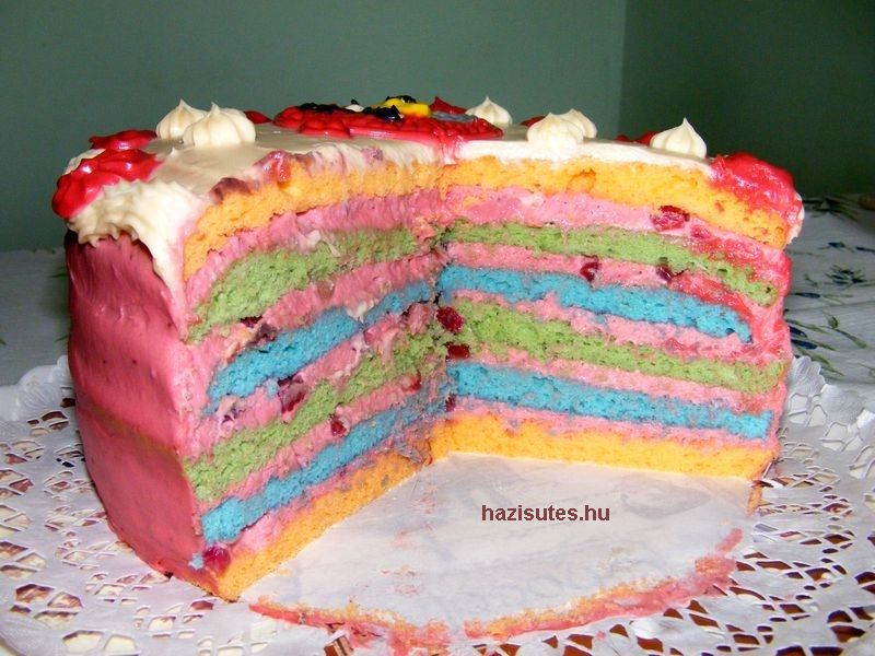 Kisfiam a névnapjára hasonlót rendelt, csak epres változatban. Férjem ötlete, és elnevezése nyomán szivárványtorta lett belőle. |